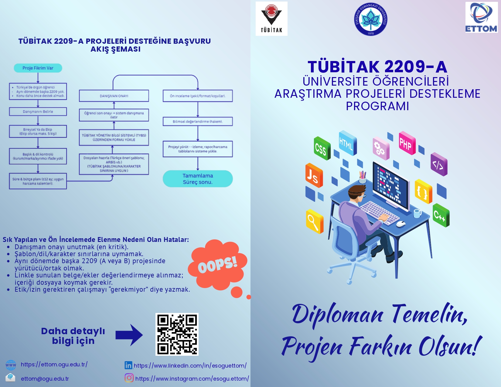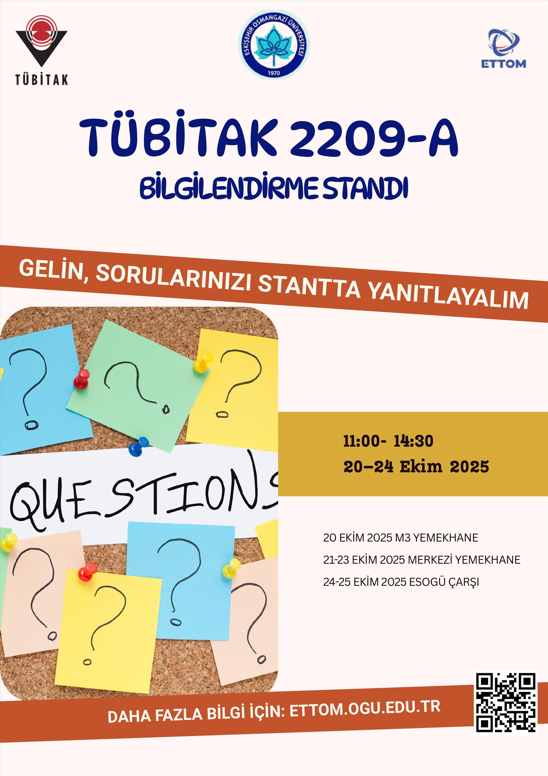 Üniversitemiz ETTOM Proje Ofisi tarafından 20–24 Ekim 2025 haftasında, TÜBİTAK 2209-A Üniversite Öğrencileri Araştırma Projeleri çağrısı kapsamında Merkez Kampüs’te bilgilendirme ve başvuru danışmanlığı stantı açılacaktır. (Başvuru dönemi: 13 Ekim–13 Kasım 2025.)